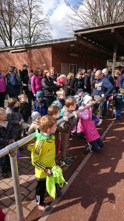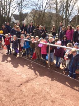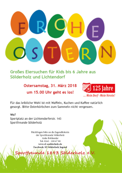 Bei herrlichem Sonnenschein und frühlingshaften Temperaturen was das Ostereiersuchen am Ostersamstag, 31.3., auch in diesem Jahr wieder ein voller Erfolg. Bereits kurz nach 15.00Uhr waren alle 300 versteckten Ostereier durch die über 30 anwesenden Kinder zwischen 2 und 6 Jahren gefunden. Im Anschluss konnten die Kinder mit Ihren Eltern und Großeltern noch frische Waffeln und Kuchen essen. Außerdem wurde noch kostenloses Kinderschminken und Osterhasenbasten angeboten. Gut gestärkt ging es dann natürlich für die Kleinsten mit Papa auf den Fußballplatz, um die ersten Tore auf unserem Platz zu erzielen.