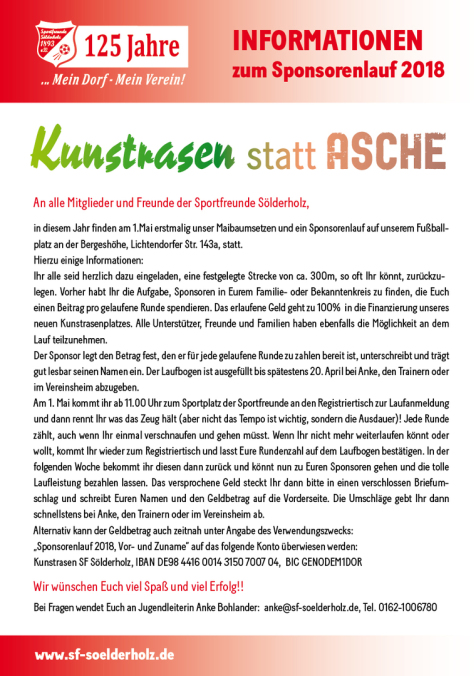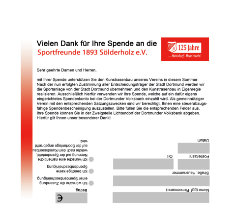 Von Freitag 20.04. bis Sonntag 22.04. wurden durch die Jugend der SF Sölderholz im ganzen Dorf die unten abgebildeten Spendenbriefe verteilt. Im Sommer möchten wir mit dem Bau unseres Kunstrasens beginnen und das kostet uns natürlich sehr viel Geld, daher sind wir auf Spenden für dieses Projekt angewiesen. Wir freuen uns über jede kleine und große Spenden und bedanken uns recht herzlich für Ihre Unterstützung.