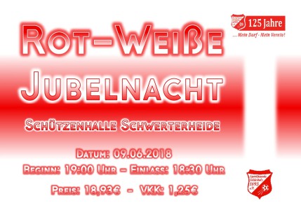 Unsere Hauptveranstaltung zu unserem Jubelfest am 09. Juni 2018 wird in der Schützenhalle Schwerterheide stattfinden. Obwohl wir die größte Halle in der näheren Umgebung für unserer Veranstaltung gewählt haben, ist die Zahl der Karten, die wir dazu verkaufen können, auf 300 Stück begrenzt.