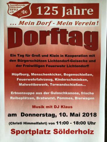 Am heutigen Vatertag startet der Dorftag um 11.00Uhr auf dem Sportplatz der Sportfreunde an der Bergeshöhe. Wir werden jede Menge Aktionen und Spiele für jedes Alter anbieten und unseren Geburtstag mit Euch feiern. Lasst Euch überraschen, sobald die Planungen abgeschlossen sind werden wir hier mehr bekannt geben.