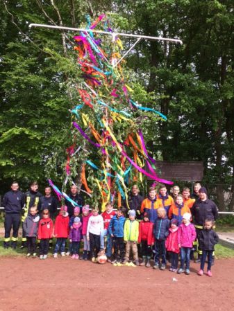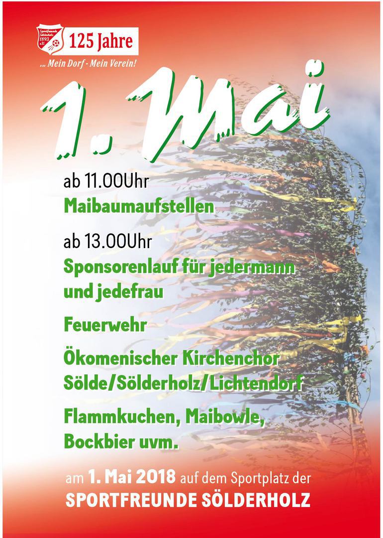 Ein toller Tag auf dem Fußballplatz der Sportfreunde stand am 01.Mai ganz im Zeichen des ersten Maibaumsetzen. Pünktlich zum Beginn der Aktivitäten um 11.00Uhr kam die Sonne raus. Viele anwesende Kinder auf dem Fußballplatz haben geholfen, den Maibaum zu schmücken. Mit Hilfe der freiwilligen Feuerwehr Lichtendorf wurde der toll geschmückte Baum dann aufgestellt. Der ökom. Gemeindechor Lichtendorf/ Sölderholz/ Sölde hat diese Aktion mit vielen schönen Liedern zum Maibeginn begleitet.