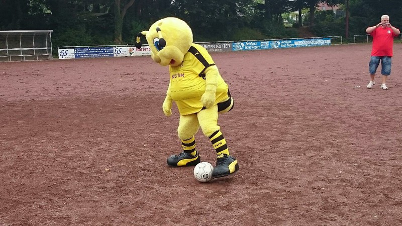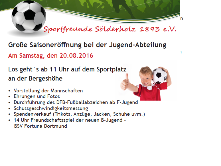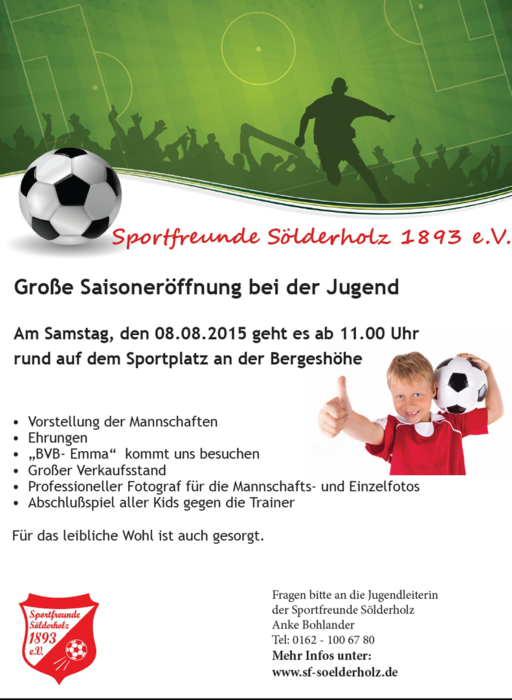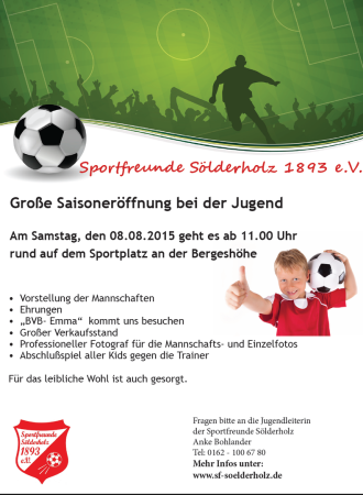 Zum 1. Mal in Ihrer Vereinsgeschichte hat die Jugend der SF Sölderholz am 8.8. Ihren Saisonauftakt begangen. Alle 7 Jugendmannschaften mit fast 130 Kindern, Trainern und Eltern sind auf dem Fußballplatz an der Lichtendorferstr. erschienen, um die neue Saison 2015/16 gebührend zu beginnen. Alle Kids und Trainer wurden vorgestellt und die langjährigen Vereinsmitglieder und Trainer haben eine Urkunde erhalten. Danach wurden professionelle Mannschafts- und Einzelfotos erstellt und es gab einen Trikotverkaufsstand. Gegen 12.30Uhr kam das BVB-Maskottchen Emma die Kids und Ihre Eltern, zur Autogrammstunde, besuchen. Zum Abschluss hat Emma noch ein Spiel alle Kids gegen alle Jugendtrainer und Vorstand angetreten. Dieser 1. Saisonauftakt war für die ganze Jugendabteilung ein riesen Event und das angestrebte Ziel: leuchtende und strahlende Kinderaugen zu sehen wurde zu 100% erreicht. Unser besonderer Dank gilt den engagierten Eltern, ohne die ein solches Event in unserem kleinen Dorfverein nicht möglich ist.