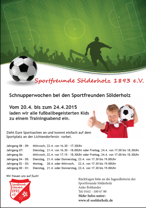 Zum ersten Mal wurden bei der SF Sölderholz 6 Jugendliche erfolgreich zum Gruppenhelfer ausgebildet. An der Seite unserer Fußballtrainer gestalten Sie bereits das Training der jüngeren Mannschaften aktiv mit. Sie nehmen Einfluss auf die Auswahl von Bewegungs- angeboten, bringen Trends ein und berücksichtigen so die Bedürfnisse von Jüngeren. Zudem sollen sie dazu beitragen, dass im Verein auch außerhalb des Sportbetriebs für junge Menschen eine Menge los ist. Bei der Auswahl, Planung und Durchführung von Aktivitäten (z.B. Minisportabzeichen, Fahrten, Feste) unterstützen sie die Jugendleiterin. Die Jugendabteilung der SF hat diese Ausbildung finanziert. Für Ihre ehrenamtliche Unterstützung erhalten die Kids auch einen Eintrag ins Zeugnis und einen Ehrenamtsnachweiß, den Sie zu Ihren Bewerbungsunterlagen beifügen können. Interessierte Fußballkids können jederzeit beim Training teilnehmen: Infos unter: www.sf-soelderholz.de